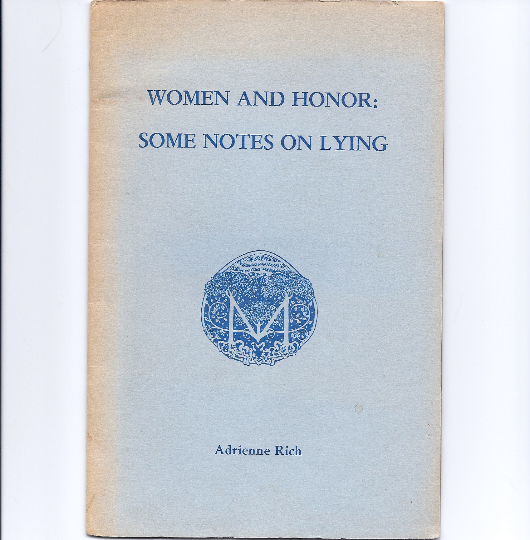 Twenty-one Love Poems, by Adrienne Rich, was the first lesbian poetry book I read. A fellow cadet when I was at ROTC camp after my junior year of college in 1980 suggested I read it, knowing something about me before I knew it myself. I went on to read much of her other work but the one piece that affected me the most, that in many ways defined me as a young adult and fledging dyke, was Adrienne Rich’s Women and Honor: Some Notes on Lying (1975).